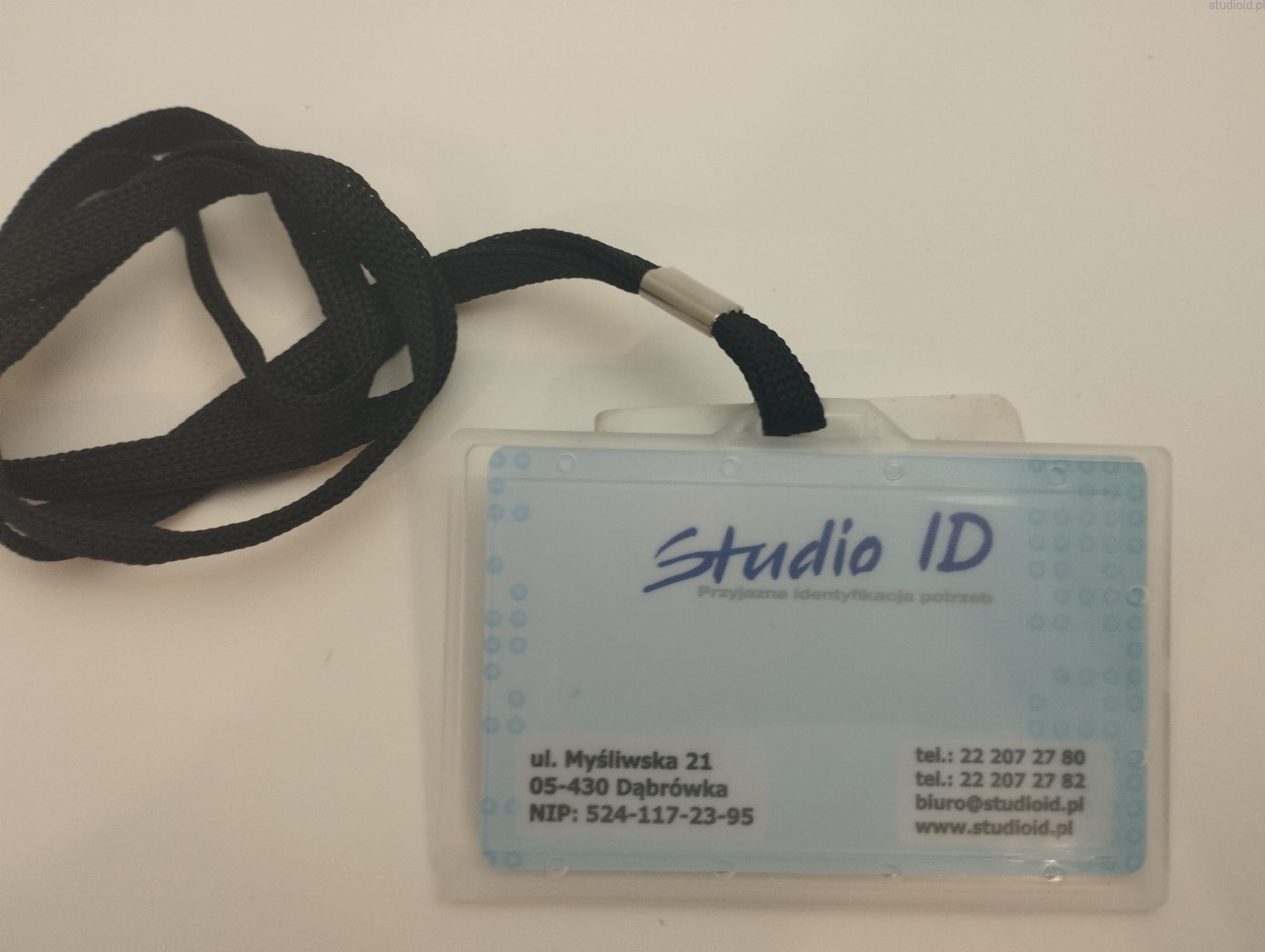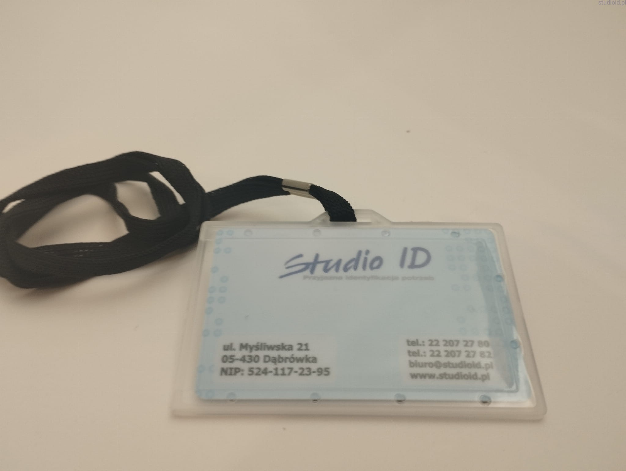 Holder poziomy przezroczysty na kartę/identyfikator plastikową lub zbliżeniową zintegrowany z zawieszką 1 cm na szyję (smycz) bez nadruku.